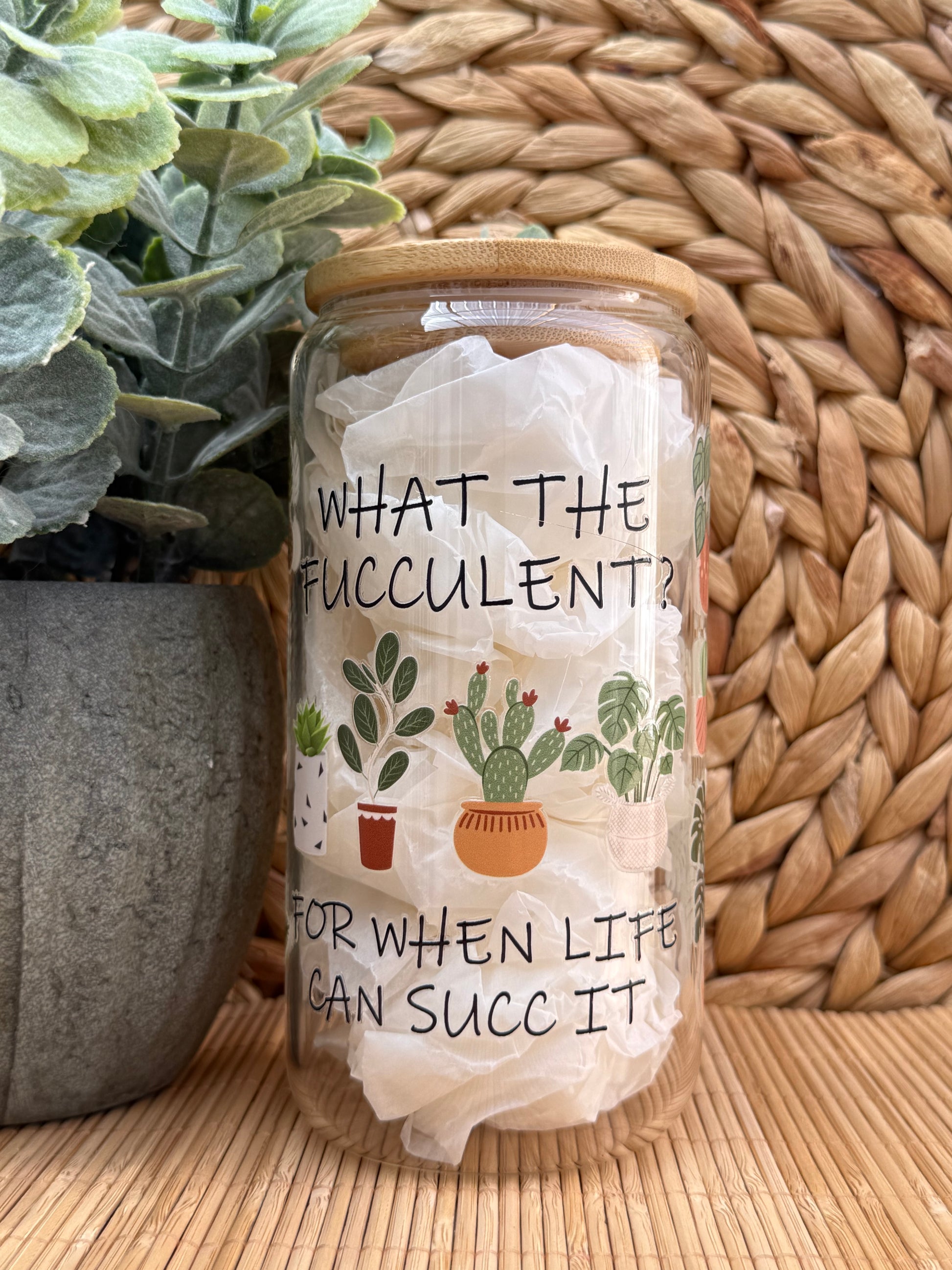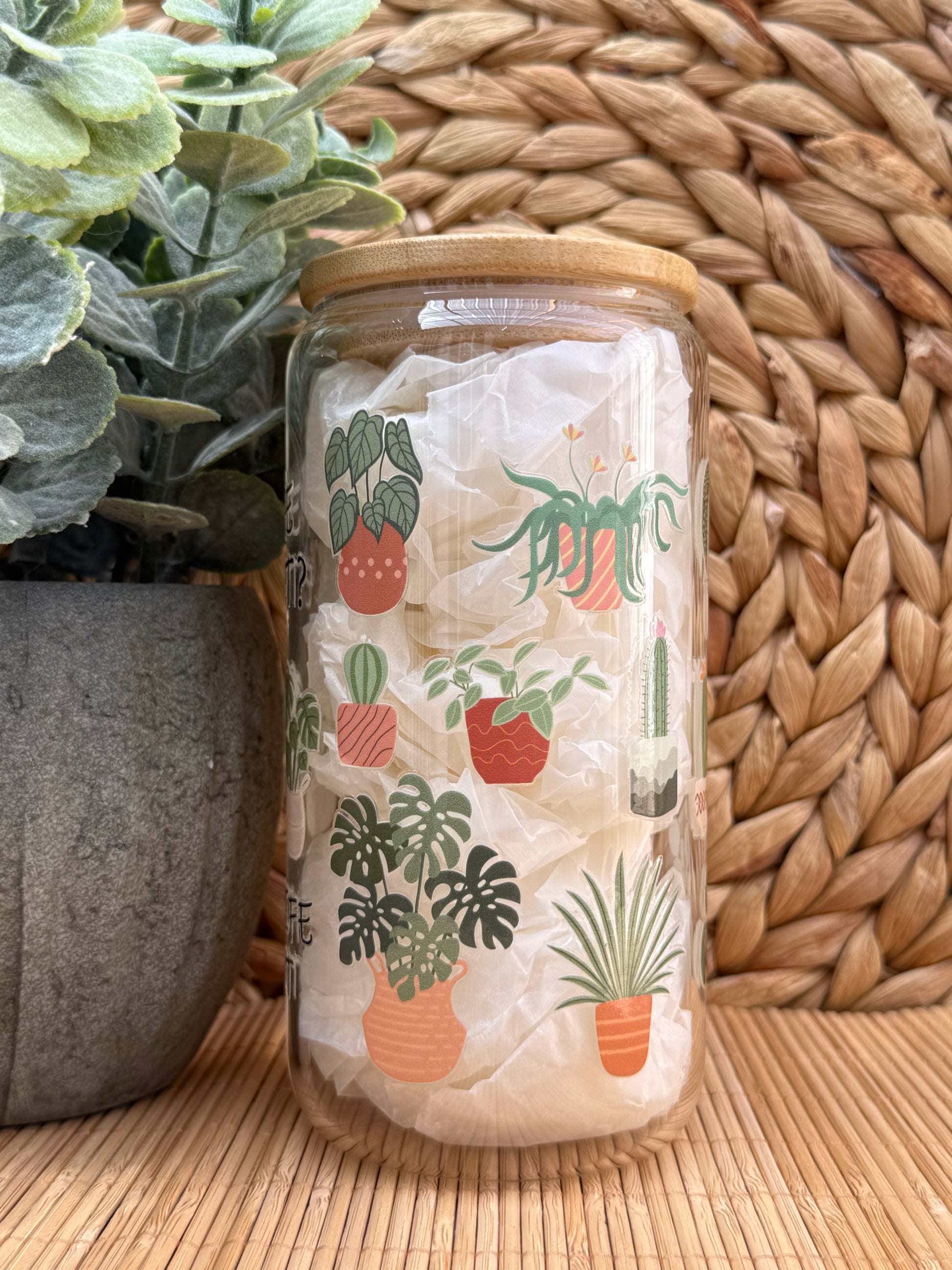 Stylish glass tumbler decorated with modern plants with a natural bamboo lid finish.