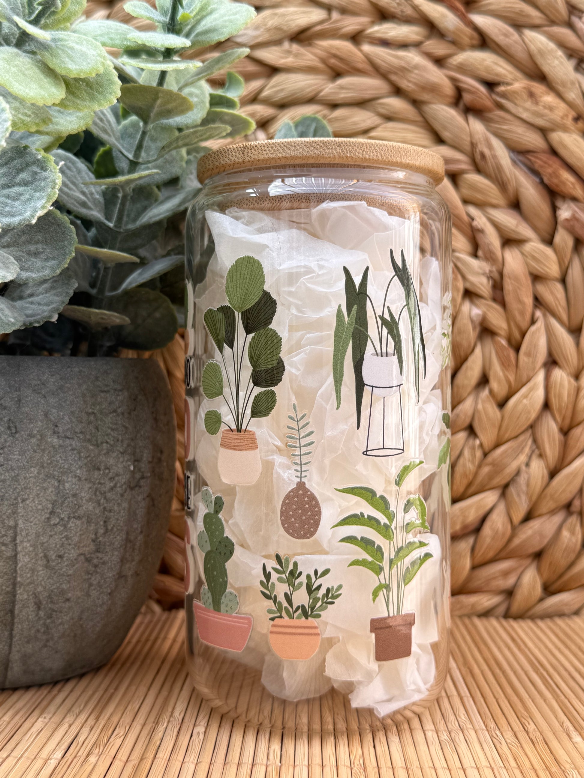 Stylish glass tumbler decorated with modern plants with a natural bamboo lid finish.