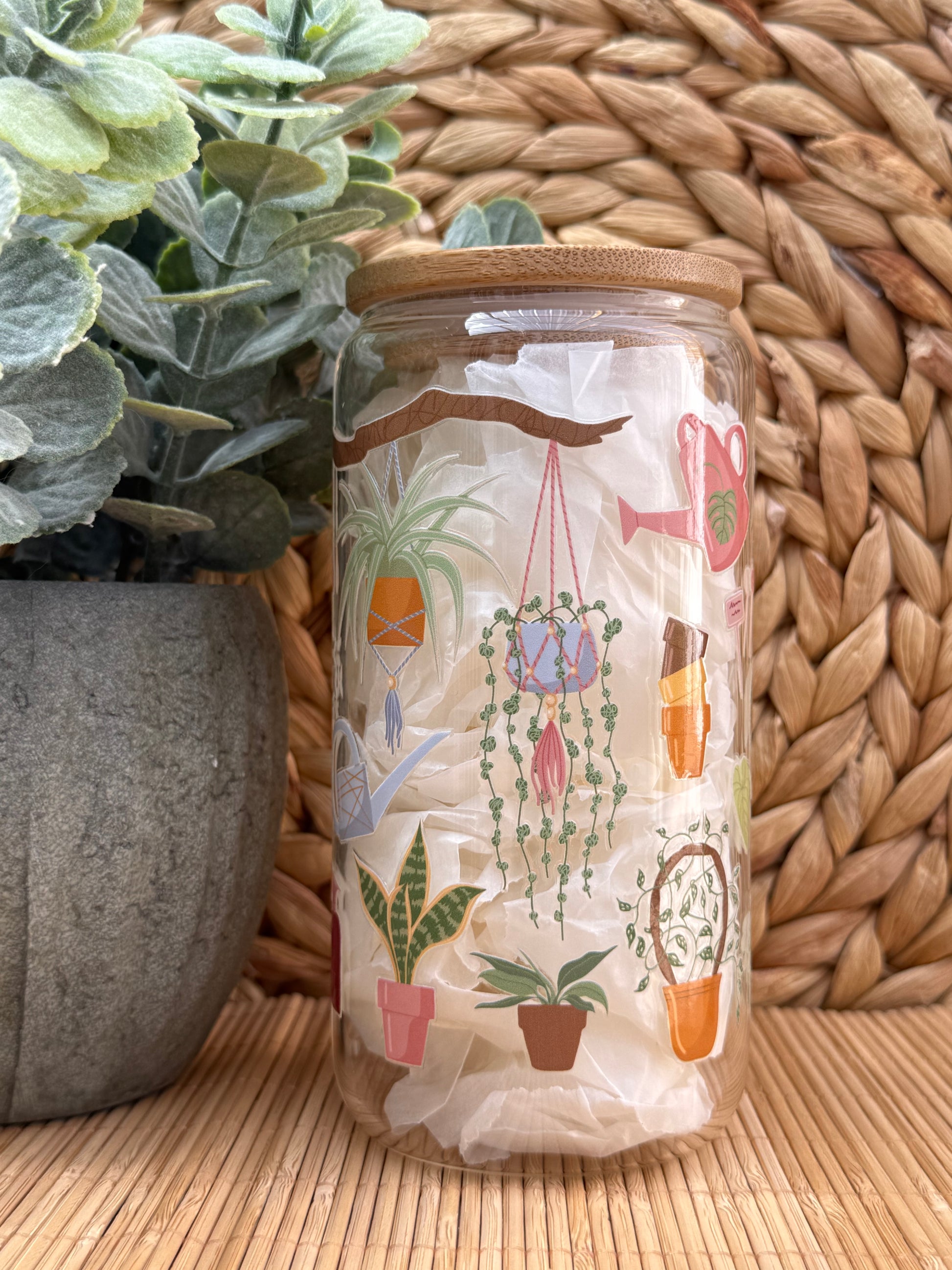 Stylish glass tumbler decorated with modern plants with a natural bamboo lid finish.