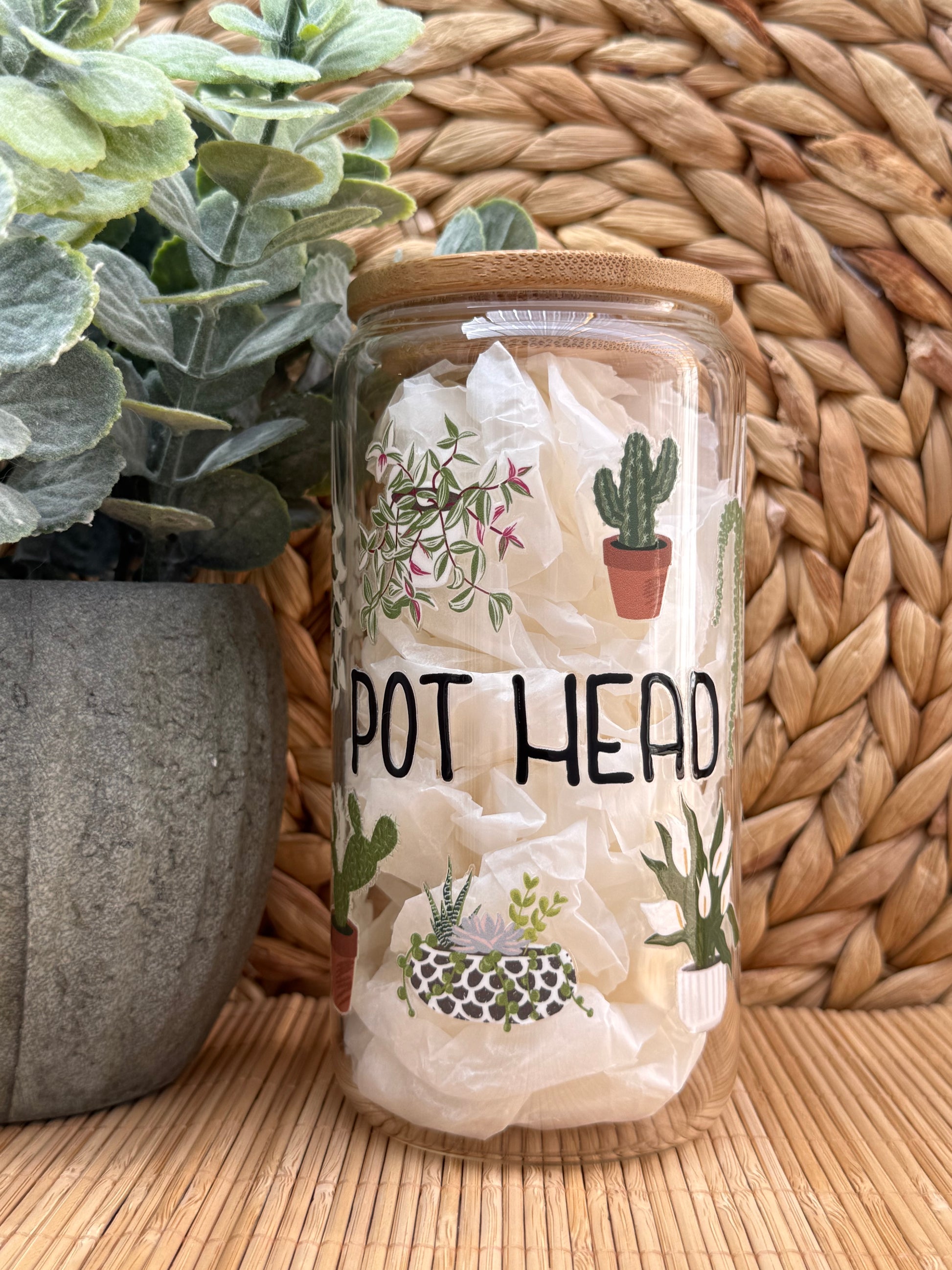 Stylish glass tumbler decorated with modern plants with a natural bamboo lid finish.