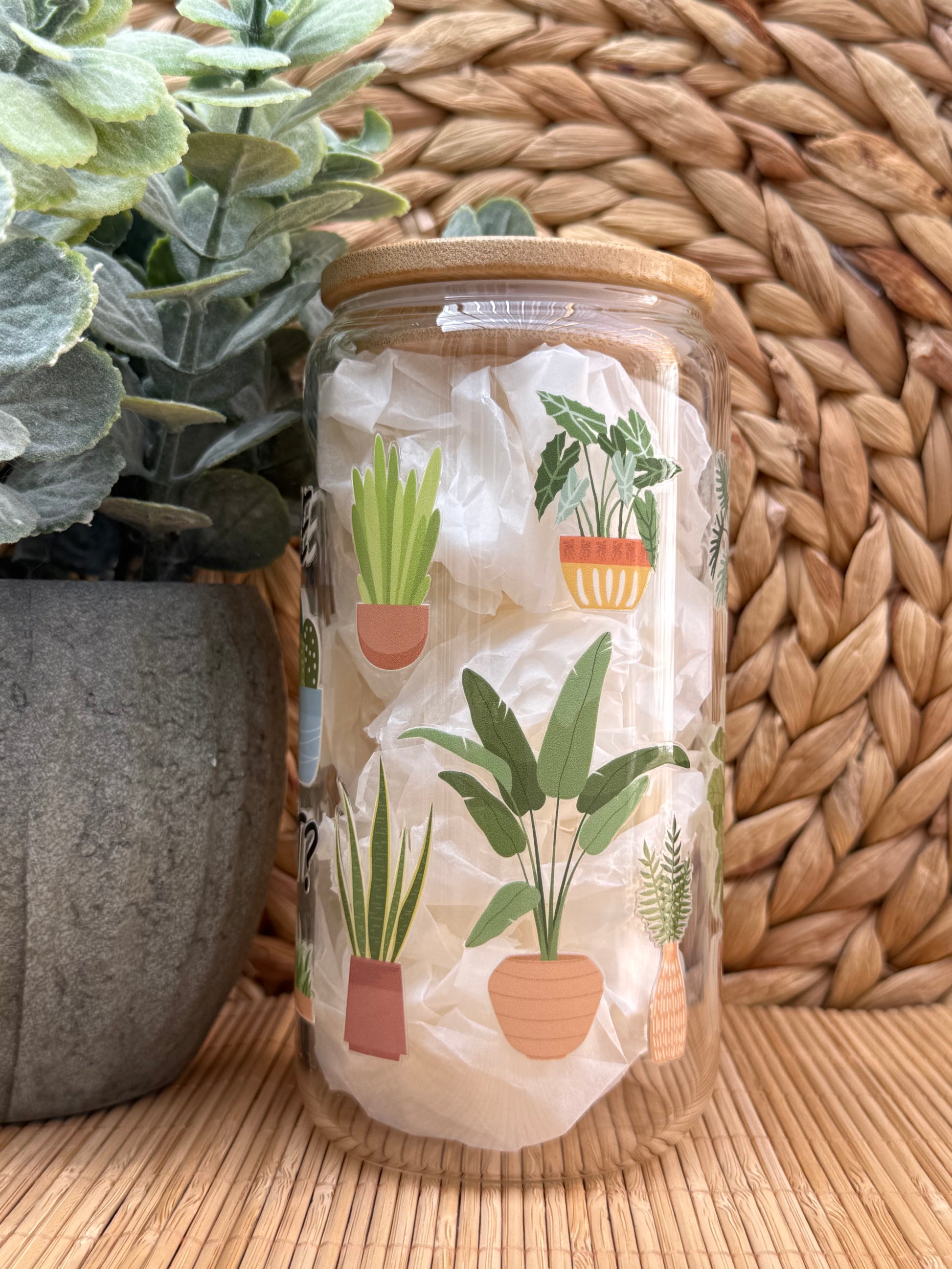 Stylish glass tumbler decorated with modern plants with a natural bamboo lid finish.